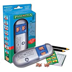 The cutest dice game in the world. Roll the minature pigs to score depending on how they land - Razor Backs, Snoutesr, Leaning Jowlers - each carries a different value. Keep rolling to build your score, but watch out, you'll loose your turn's points if you roll a sider and all your points if the pigs touch! First to 100pts wins (or 200, 300 .. you choose)