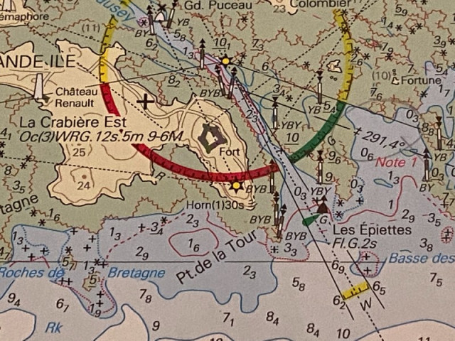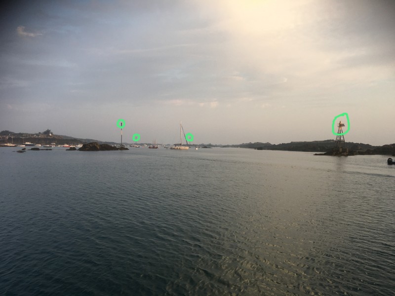The almanac was our first point of call followed by Mr Cunliffe's Shell Channel Pilot. Iles Chausey is a secondary port to St Malo but lying quite close the differences were negligible, all corrections for Iles Chausey showed a + against the St Malo tidal heights. The time differences were the same for all times of high water and all times of low water so no complicated calculations were required. As can be seen, the entrance to the channel is clearly marked for both day and night entry with a lit green lateral mark and a sectored white light to see us in at dusk, when we arrived. There are also plenty of unlit cardinal marks for day time navigation (circled in green on the photo above).