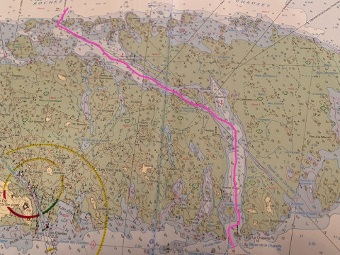 The following day we decided that it might be fun to navigate down the centre of Iles Chausey, whilst there are many navigable channels at the right height of tide, we thought we would start with the one that looked the easiest. So after swims and breakfast were complete we set out. The pink line shows the track we followed (this is not off a chart plotter, but my rather wobbly line put on a photo). I would like at this point to impress you all and say this was done without the use of electronics but I would be lying. I do however think it could be done without the use of electronics and below is how I would do it 😊.