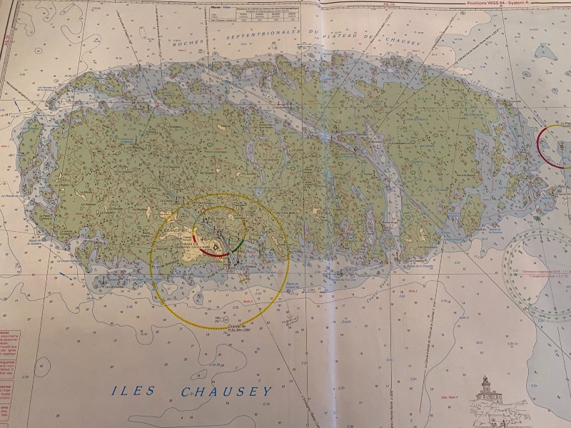 Now for those of you wondering what the little green circle is on the chart above, this is where we anchored on our second visit to Iles Chausey, yes, we came back !! Following a fab couple of days in St Malo we returned to Iles Chausey, again we tried to get on the visitors mooring buoys but there was no room at the inn. Having been spoken to firmly by a local french ferry man we were told in no uncertain terms that we could not use the mooring buoys we had previously picked up so we elected to anchor. Now I have no problem with anchoring, the conditions were very benign, I have a problem with the fact that due to our Solent based activities and having a manual anchor we do not carry the 60m of chain I would have preferred in these circumstances.
