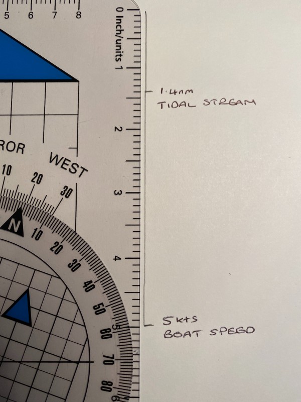 If you are travelling a short distance but across a pretty strong tide, the quick CTS method can be quite useful. In this instance you will not need dividers simply a plotter but you will need all the other associated information to formulate your CTS. See Course to Steer.